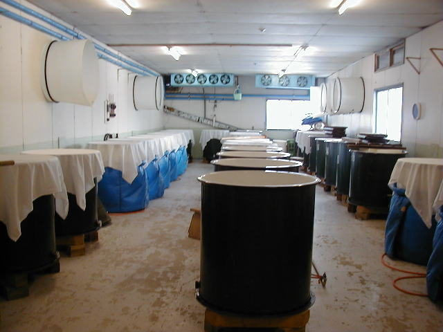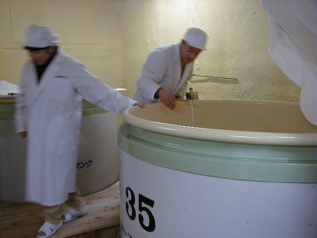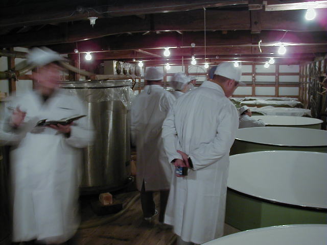 次に速醸酒母室を見に行くのだが,途中に山廃酒母室(専用の部屋)があった。山廃造りは微妙なのか中には入れなかったが,逆に気合が伺える。速醸主母室(写真)では,メロンの香り,バナナの香りのするものなどがあり,部屋にいるだけでとても気持ちが良くなってくる。