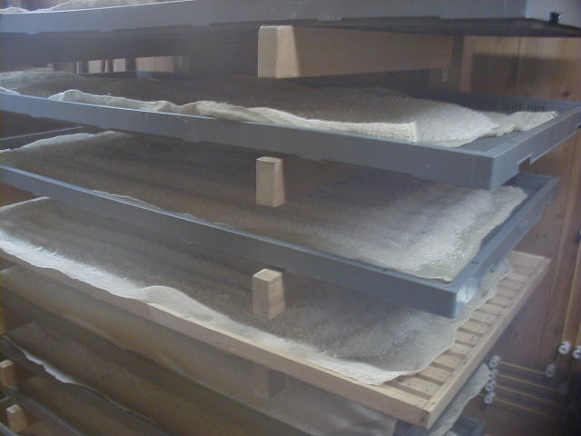 麹にされる米は蒸された後,放冷されて麹室に運び込まれる。麹室では米に麹がふりかけられる。西田酒蔵さんでは床麹でやられているようだ。麹室の温度は室温42°Cで,けっこう暑い。華吹雪の麹米(写真)を触らせて頂いたが,手触りはさらさらしている。かじってみると少し甘いような気がする。