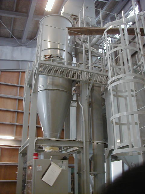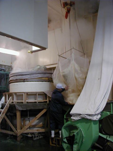 蒸し上がった米が300kg毎にクレーンでつり上げられて放冷機に入れられ(写真),パイプで次の工程に送られる。放冷機につながっている布(ビニール?)は、熱い蒸気を部屋の外へすごい勢いで排出している。空気を吹きつけるのではなく,空気を吸い出すことで空気が蒸米の間を通り,その時に米の熱を奪っていくということである。