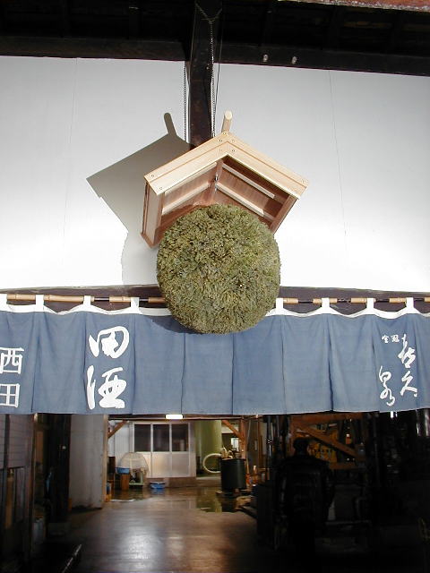 予定を少し遅れて,10時過ぎに西田酒造に到着した。吹雪の中から垣間見える「喜久泉」の看板(写真)が渋い。中には新酒ができたことを示す新しい酒林(写真,杉の玉)がぶら下がっていた。東京では写真に写っているのれんの「田酒」ブランドが大人気だ。