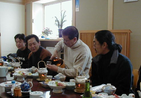 駅の近くの市場へ入って,朝ご飯を食べる場所を探す。ぶらぶらと回って,お寿司と定食の店を見つけ,どやどやと9人が入っていく。僕は市場定食1200円(写真)を注文,これはさしみ盛り合わせ,焼き魚(ホッケ),おかず4品,ご飯,お味噌汁と,東京では考えられないような価格だ。その他に誰も食べなかったが,うに丼2,500円があった。みんなゆっくり味わい過ぎて西田酒造への出発が遅くなってしまい,慌ててタクシーに乗る。そのタクシーも大雪でなかなか進まない。