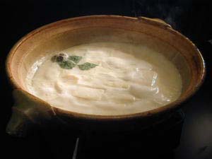 『日田三隈川源泉湧水』(アルカリ温泉水)で炊くことにより、おトーフを溶かしながら召し上がっていただく…という