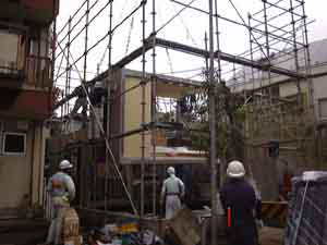 5-04. 11月3日 K邸据付見学 ハイム氏より、近所で据付があるという話を聞いたので、K邸の据付見学に行った。進パルフェのアルミ外壁のお宅だ。ハイム氏に施主のK氏ご夫妻を紹介いただく。とても温厚な方で話をしていたらご主人は私と同じ学校の出身ということで親近感が沸く。仮住まいの話から、出窓談義、ハイム氏のこぼれ話など、いろいろなお話を聞かせていただいた。 ![]() 14個のユニットが次々に積み上げられていく様子は、まさしく「ショー」だった。4時間ほど眺めていたが、こんなに早くできあがるとは思わなかった。クレーンで正確にユニットを積んでいく作業は、最先端だなと思ったが、最後に屋根を取りつける作業を見て思わず笑ってしまった。屋根材の鋼板を足で踏んで止めていくのである。いかにも原始的というか人間味あふれる作業だった。 ![]() ハイム氏は「来週、進ドマーニのタイル外壁の据付があるんですよ。大田区ではじめてのタイル外壁ですね。展示場よりおおきい凄い家なんですよ・・・・」おおっ!タイルの据付かあ。見に行きたいなと思ったが、平日とのことなのであきらめた。しかしモデルハウスより広い家ってどんな家なんだろう。大田区で1軒目のJXタイル外壁はこの家になったが、パルフェのタイル外壁はうちがはじめてになるはず・・・・とのことだった。 年明けに予定されている我が家の据付作業はどのようになるのか楽しみにしつつ、K氏ご夫妻にお礼を言い家路についた。 |
