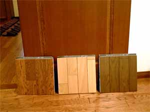 リビングのフロアに、壁紙のサンプルや床材のサンプルを広げ、あかりを調節したりして見比べてみた。わからない点は本社やインテリアコーディネーターに電話をかけてくれた。何とずうずうしい客なんだと思われてるのだろうなと思ったが、F氏は「私もまだよくわからないので勉強させてください」といろいろな資料をもってきて くれた。これで内装関係の予備知識は何とか頭に入った。 ありがとうございます>西新井展示場のF氏<m(__)m> 写真は西新井展示場で、3種類の床材を比較したところ。 |