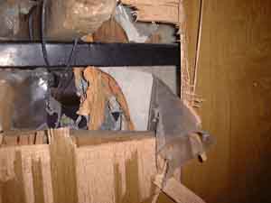 12月06日(その5) 壁に穴をあけて足場を支える木の棒を鉄骨に固定しました。25年前の積水ハウスの壁の構造がよくわかります。うちはアルミサンドイッチパネルの外壁でした。断熱材はとても薄く、グラスウールは入っていません。鉄骨は錆びていません。なんか壊すのがもったいないような気がしました。 |