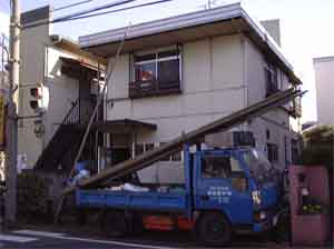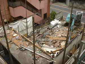 12月06日(その7) 足場を組み始めたところまでは順調にいったのですが、手配会社の計算ミス?で材料が足りないことが判明しました。結局途中まで足場を組んで作業は終了しました。次回は足場をすべて組んで養生をしてから重機による取り壊し作業に入ります。 |