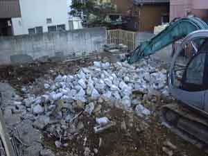 12月10日(その1) 昨日で建物の解体作業はほとんど終わりました。 あとは、バルコニーと基礎の掘り起こし作業が残っています。手前の部分は玄関付近です。25年前の基礎はこの程度だったんですね。 |
