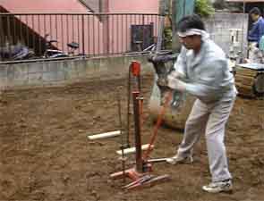 12月14日(その1) 朝から地盤調査がはじまりました。 スウェーデン式サウンディング試験法による調査です。SK式のものに比べて機材が大がかりなものに思えます。スクリューを回転させながら地中に埋め込んでいき地盤の状況を調べていきます。 |