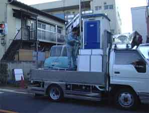 12月15日 仮設トイレ設置業者がきて現場に仮設トイレを設置していきました。水洗式です。汚物を溜めておくタンクが下についています。 |