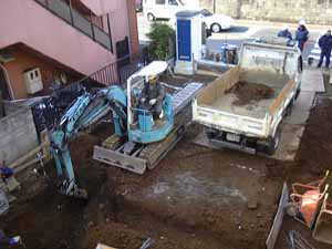 12月23日(その1) 掘りおこす部分に白線が引かれて、ユンボが土を掘りおこしていき、残土をダンプに積みます |