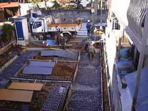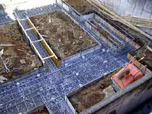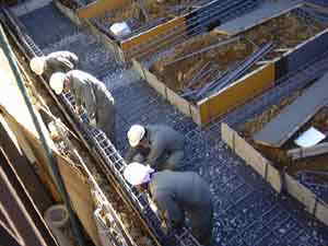 12月26日(その7) 基礎の東側部分です。ベース配筋の下にサイコロの形をしたものを入れていきます。これで配筋の下側にもコンクリートがまわるようになります。 |