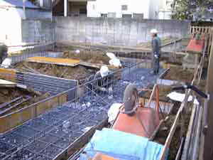 12月26日(その8) 道路側の基礎のベース部分が下がるところです。道路側に車を縦列駐車させるのので、駐車スペースに土間コンクリートを打つ時に基礎に影響が無いようにするためだそうです。うちでは駐車スペースに土間コンクリートを打ちませんが、将来のことも考えてこの作業もお願いしました。 |