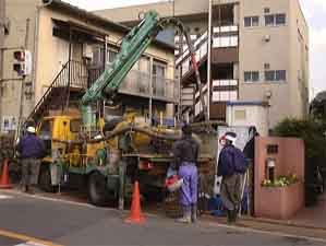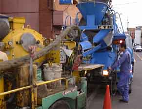 12月26日(その10) ミキサー車が到着しました。打設する車にコンクリートを送り込みます。ミキサー車は入れ替わり立ち替わり何台も来ました。 |