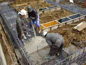 12月27日(その1) 翌朝の現場です。ベース部分のコンクリート打ちが終わりました。これから立ち上がり部分のコンクリート打ちですが、都合で見られませんでした。 |