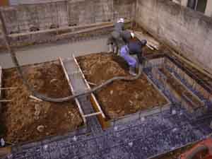 12月26日(その11) いよいよ打設開始です。ホースの先から勢いよくコンクリートが出てきます。それを手際よく慣らしていきます。ホースを持っている人のウエストポーチは、コンクリート出る量や、アームを動かすコントローラーになっています。 |