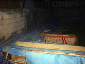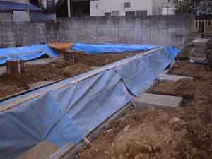 12月27日(その2) 作業が終わった後の夜に撮影した現場風景です。立ち上がり部分は、すでにコンクリート打ちが終わって型枠で覆われていました。シートがはがれないようにしっかりと止められています。 |