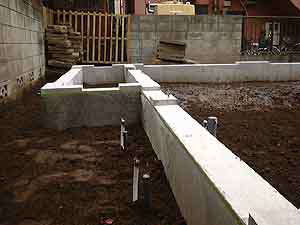 01月13日(その2) 基礎の外側に出ている管は、給湯器にいく配管です。据付後に外壁に給湯器をとりつけます。1階2階のふたつの給湯器がつきます。 |