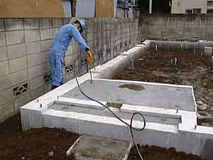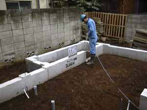 01月13日(その4) 基礎部分に「GL処理スミ」のペイントをしてから薬剤散布開始です。特にマスクもしていませんでした。昔ほど薬も強くないそうです。 |