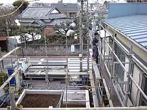 01月13日(その8) 午後から足場の組立作業が始まりました。据付やその後の工事で、外回りや屋根関係の工事の時に使用します。 |