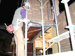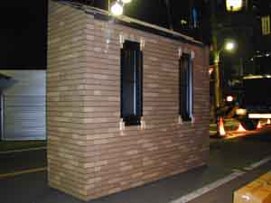 | 2001年1月14日深夜から〜15日早朝にかけて据付工事が行われました。現場はとても寒くて、ついに仮住まいから石油ストーブを出して来て暖まっていました。1階の4つのユニットが終わって次はオーバーハングというところで、オーバーハング据付場所で待っていたのですが、なかなかユニットがきません。そして表に戻ってみたら・・・・ |