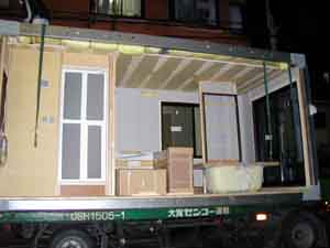 その13 2階の一番奥のユニットが到着しました。左側の扉のついている部分はユニットバスです。浴槽もすでに積み込まれています。早速、道路に降ろされました。(^^ゞ |