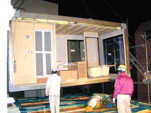 その15 クレーンの微妙な操作で、1階部分の上に重ねられます。赤いジャケットを着た人が無線機を持っていてレッカー車の作業員にクレーン操作の細かい指示を出しています。 |