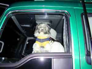 その17 ユニットを運んできたトラックに差し入れを持っていったら、助手席には運転手の奥様(彼女?)と思われる方とこのワンちゃんがいました。はいポーズ! 他にも助手席に子供を乗せて来ていた車がありました。お父さんの仕事ぶりを見せるのにはいいのでしょう。 |