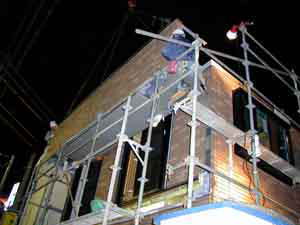 その20 足場には作業灯が取り付けられているのですが、このライトがなかなかいい雰囲気でした。現場を見ながら「家ができたらライトアップしてみようかと」ハイム氏と話していたのでしたでした。 |