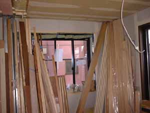 資材はユニットとともに積まれてきましたので、中は材料でいっぱいです。写真は2階リビング出窓付近です。(写真0115-1762) |