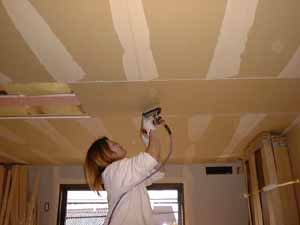 ユニット継ぎ目部分は壁材と天井材ははらずに据付されています。据付のあとでこのように壁と天井がはられます。写真はF大工さん (写真0115-1844) |
