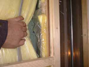 壁の断熱材をめくってみました。この外側は、シンセライトの壁材がありそれにタイルが貼られています (写真0115-1854) |