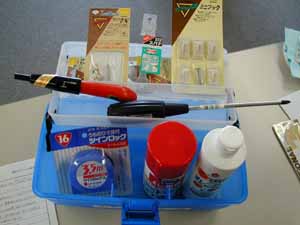 お手入れセットの内容です。これはセミナー用のもので、実際には引渡し時に受け取ります。赤いキャップのものはCRC556のシリコンオイルタイプのものです。黒キャップのものより高いですが、いろいろと活用できそうです。 (写真0127-P1280031) |