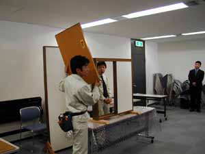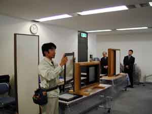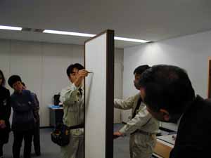 ハイムのメンテナンス担当の方によりお手入れセミナーがはじまりました。まず戸車の調整方法についての講習です。引き戸の下の部分にあるネジを回して調整します。 (写真0127-P1280032) |