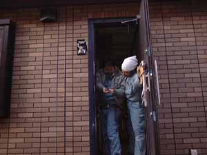 後日行われた玄関灯の交換作業風景です。これは2階玄関での作業の様子です。まだ外階段がついていないので、一人が作業をしてもう一人は落ちないように支えているという状態でした。部品の手配ミスで電気工事の方には手間をかけさせてしまいました。 (写真20010128-2547) |