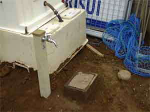 最初に水道工事業者が来たのは、工事用水道の設置でした。2000年12月のことです。地鎮祭がおわって、基礎工事がはじまるまでの間にきました。水道メーターの位置を敷地の端の方に動かして、工事用の水道栓をつけました。 |