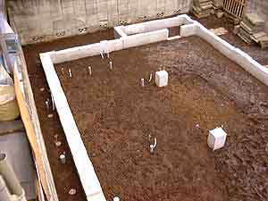 次に来たのは地中に水道配管を埋設するときでした。2001年1月のことです。このときはただひたすらに穴掘りをしていたそうです。立ち上がり部分の配管の上に水回りの設備が設置されます。 (写真20010113-01) |