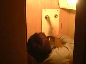 取付がおわり取り出し口の金具にテープを貼って今回の作業は終わりです。1階の洗濯機置場の水栓は、洗濯機の奥側からでなく左側につけることにしましたこれもスペースを有効に活用するための工夫です。 (写真20010130-2323) |