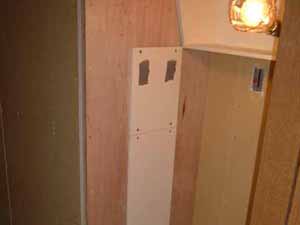 今回の工事は、2階への露出配管工事と、建物の内部の配管工事です。写真は1階洗濯機置場の工事の様子です。管に断熱材を巻き付けています。 (写真20010130-2315) |
