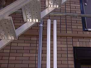 2階への露出配管の様子です。 まもなく外階段の工事に入るため足場を取り外しますので、それまでに露出配管工事を終わらせなければなりません。 (写真20010131-2337) |