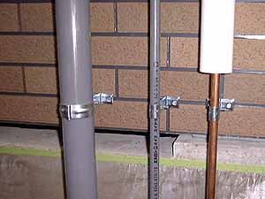 露出配管を固定している部分です。タイルの隙間のシンセライト部分の所に穴をあけて固定金具をつけて固定しています。 (写真20010201-2361) |