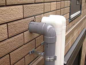 2階の建物内に引き込む部分です。特に排水管はタイルの壁をうまくくりぬいて引き込んでいます。ハイムのタイル外壁はとても固いのだそうで、ダイアモンドカッターが数回しかもたないとのことでした。工事をする人からみればやっかいな外壁かもしれません。 (写真20010201-2386) |