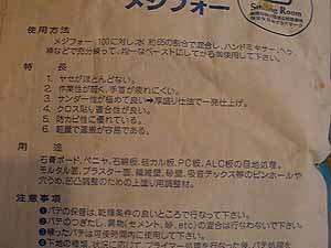 「メジフォー」の袋に書いてあった説明です。 「メジフォー100に水65」の割合で混ぜると書いてあります。 (写真20010203-2493) |