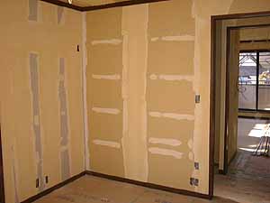 壁の目地をふさいでいる作業です。石膏ボードの継ぎ目や釘を打った穴がメジフォーのパテでどんどんふさがれていきます (写真20010203-2) |