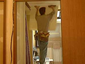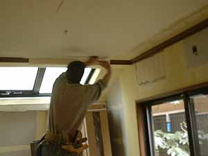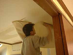 天井の縁まで貼られたクロスは、定規のようなもので、縁と天井の隙間に差し込まれていきます。そして余ったクロスは切り落とされます。 (写真20010204-2611) |