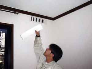 吸気がらりの手入れ方法を説明する現場監督です 24時間換気システムの吸気側になります。 (写真20010224-0338) |