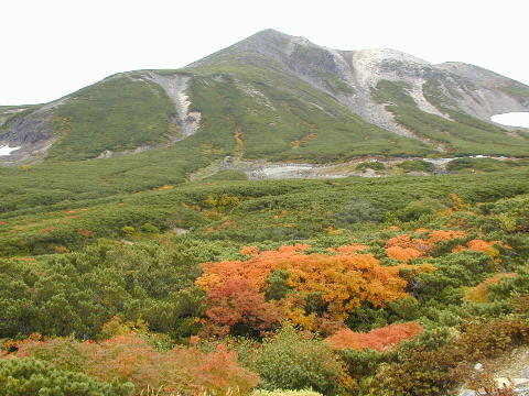 乗鞍岳剣が峰。赤は、ナナカマド。黄色はダケカンバ。緑ははいまつ。