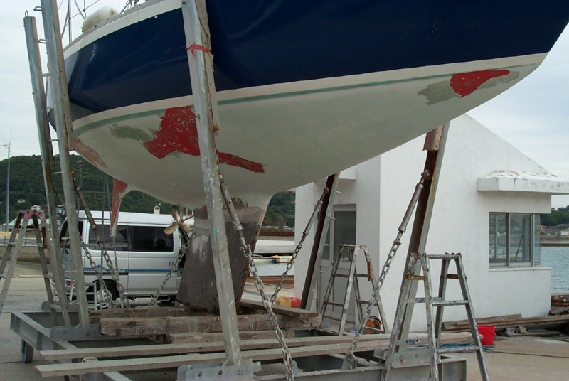 2002年10月18日 スカンピ購入から10年思い切ってバラストと船底のレストアを計画した。スカンピのバラストは鉄で出来ているため錆が激しく目立つ、また船底は何年にも重ね塗りをした塗料がかさぶたのように剥げてくる、船体のオズモシスの気になっている。作業開始まで材料・工具・天候調査・作業日程と計画をくみ、10月18日上架。作業開始