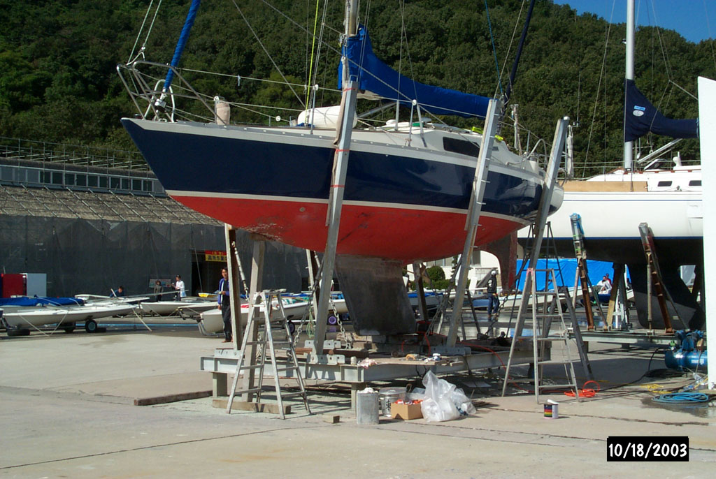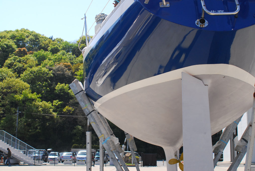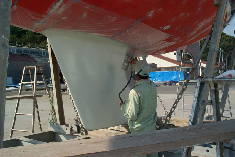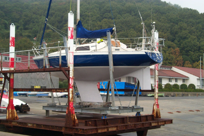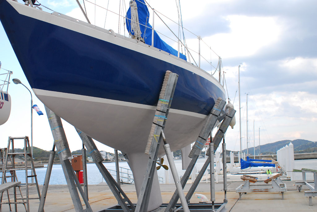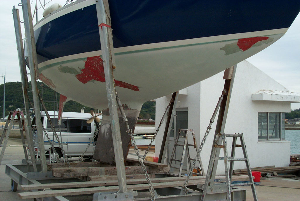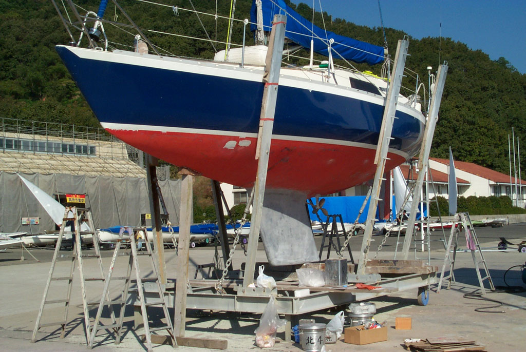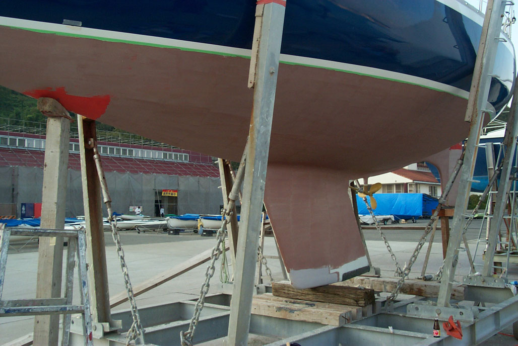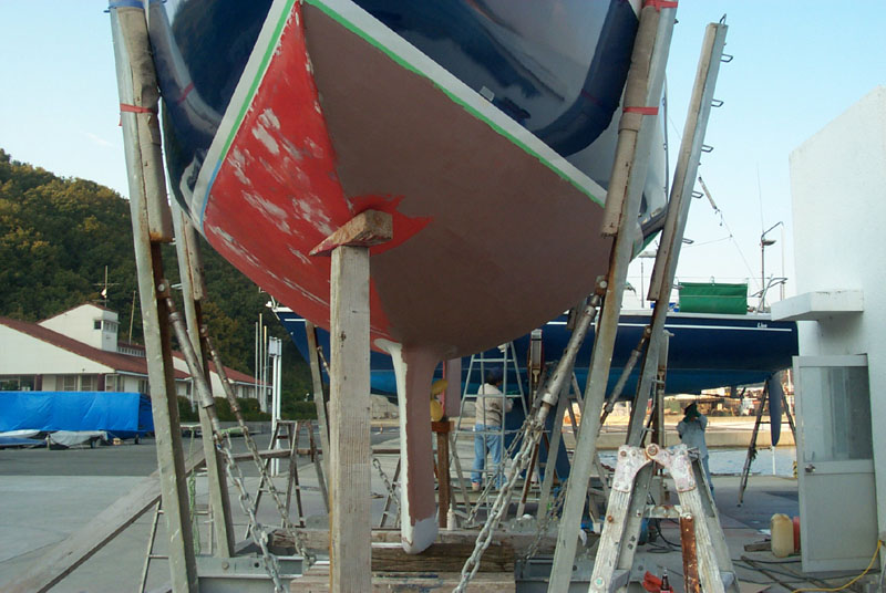 2003年秋、長年の船底塗料を剥がしバラストをFRPで処理、約4週間をかけ徹底メンテナス 製造から30年 スカンピの船体は古さ感じさせない。