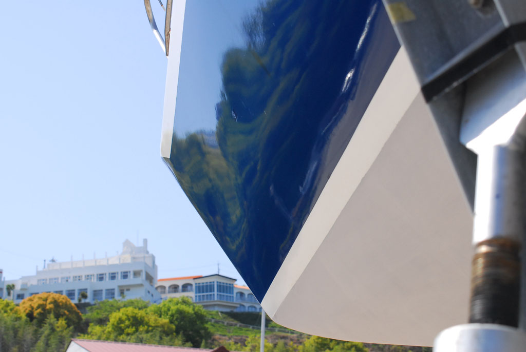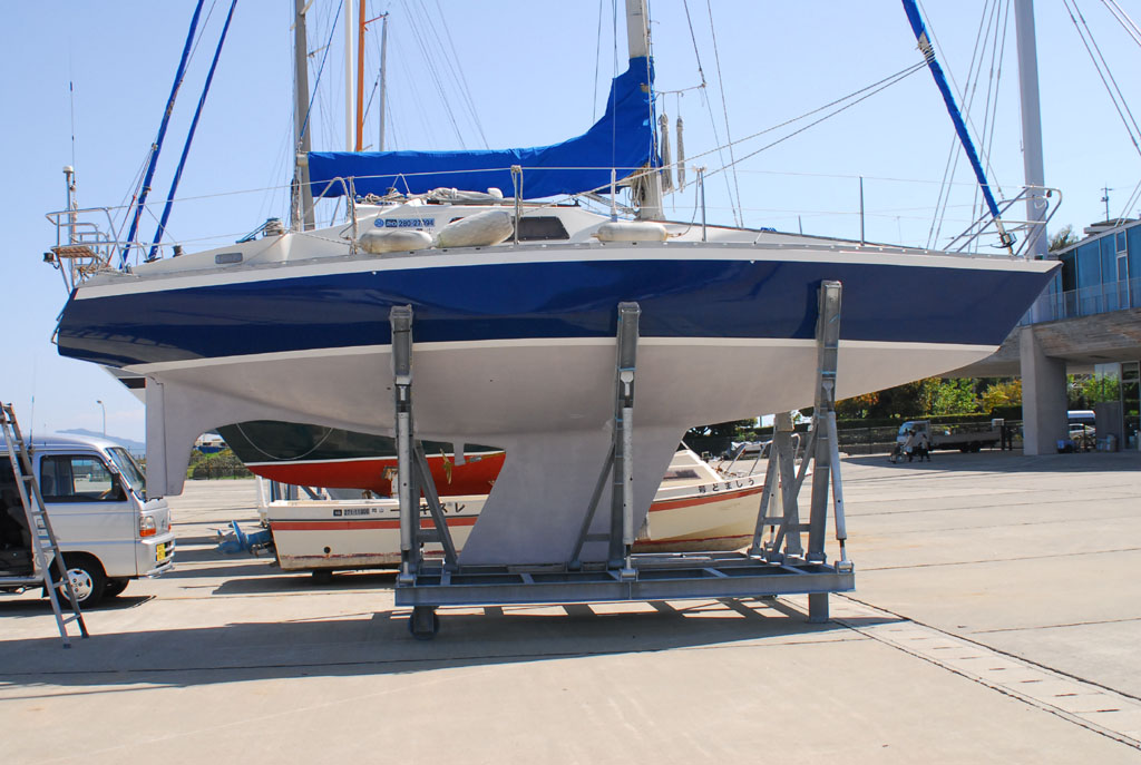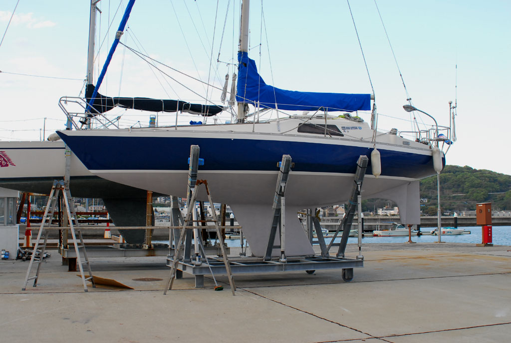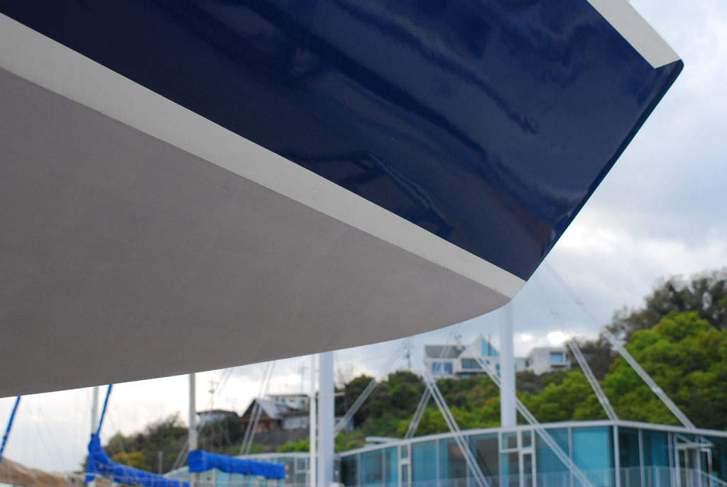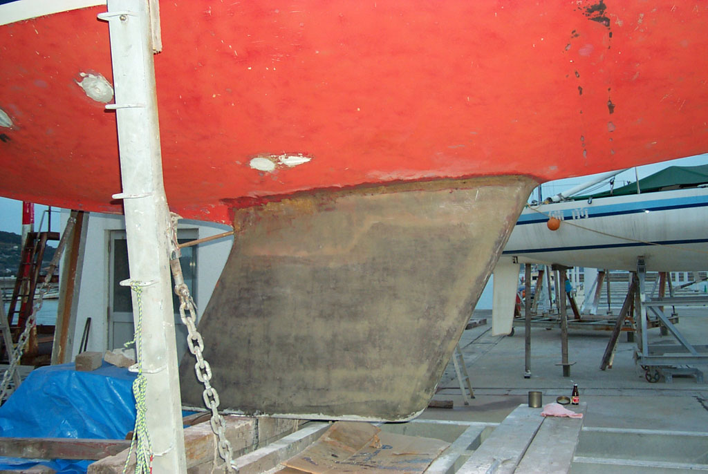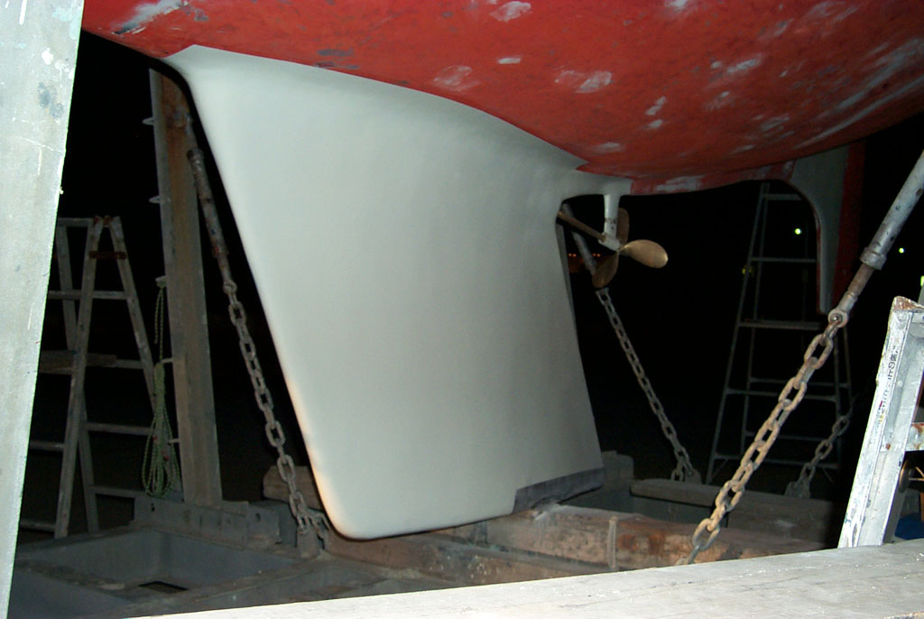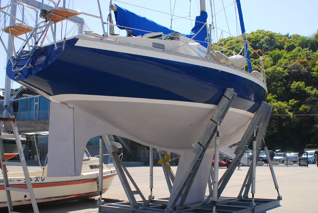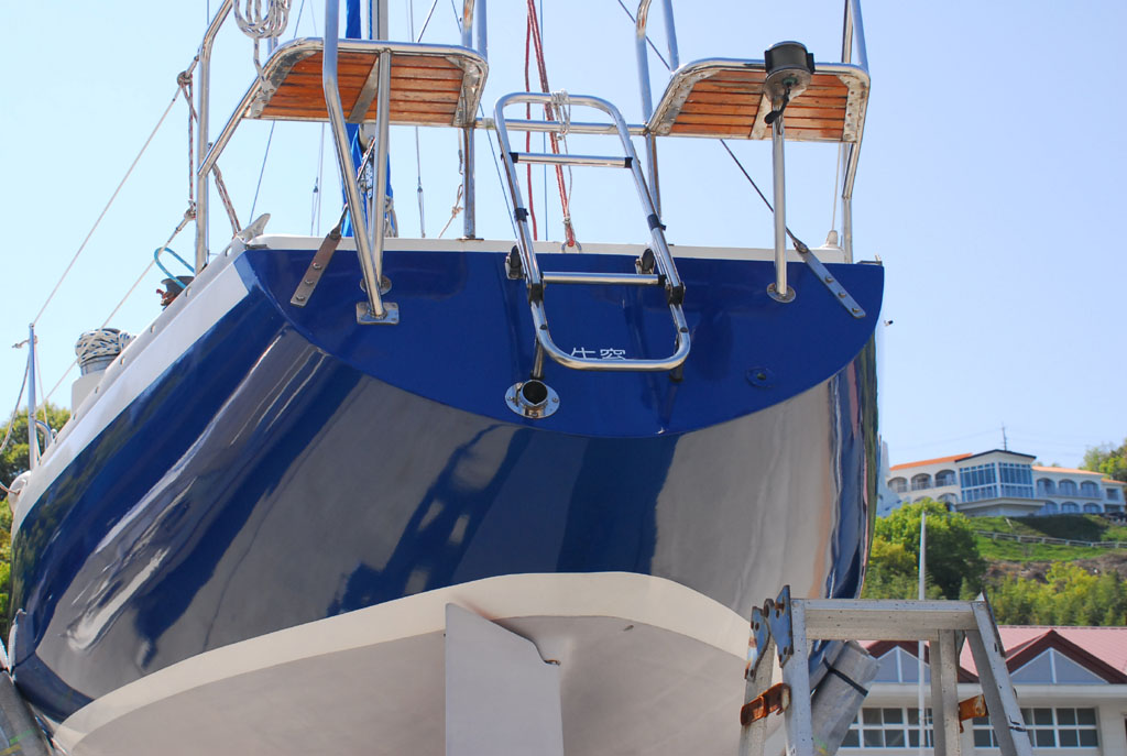 2003年秋、長年の船底塗料を剥がしバラストをFRPで処理、約4週間をかけ徹底メンテナス 製造から30年 スカンピの船体は古さ感じさせない。