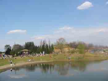 公園内には広場、池があり家族づれがお弁当をひろげ楽しんでいました。熱気球もありましたが風が強くとりあえず臨時休業の様子。 ![]() |